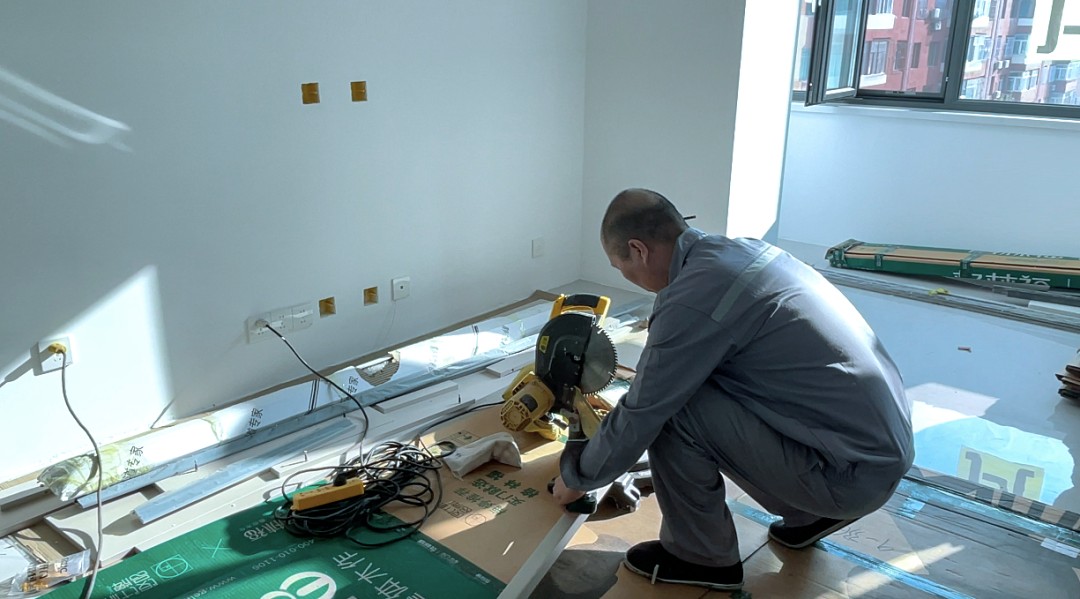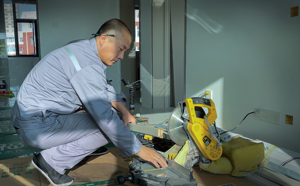 他说:“咱家的标准是边干边清,客户一进门,不能觉得咱干活埋汰。"每次安装木门时,他身边总有一个默默无声的人,那是他的妻子。他们默契的合作就是:锯落下的一片木屑,刚刚飘在空中,就被妻子的扫帚收进簸箕。客户一看,工地这么干净,心里就放心了。”