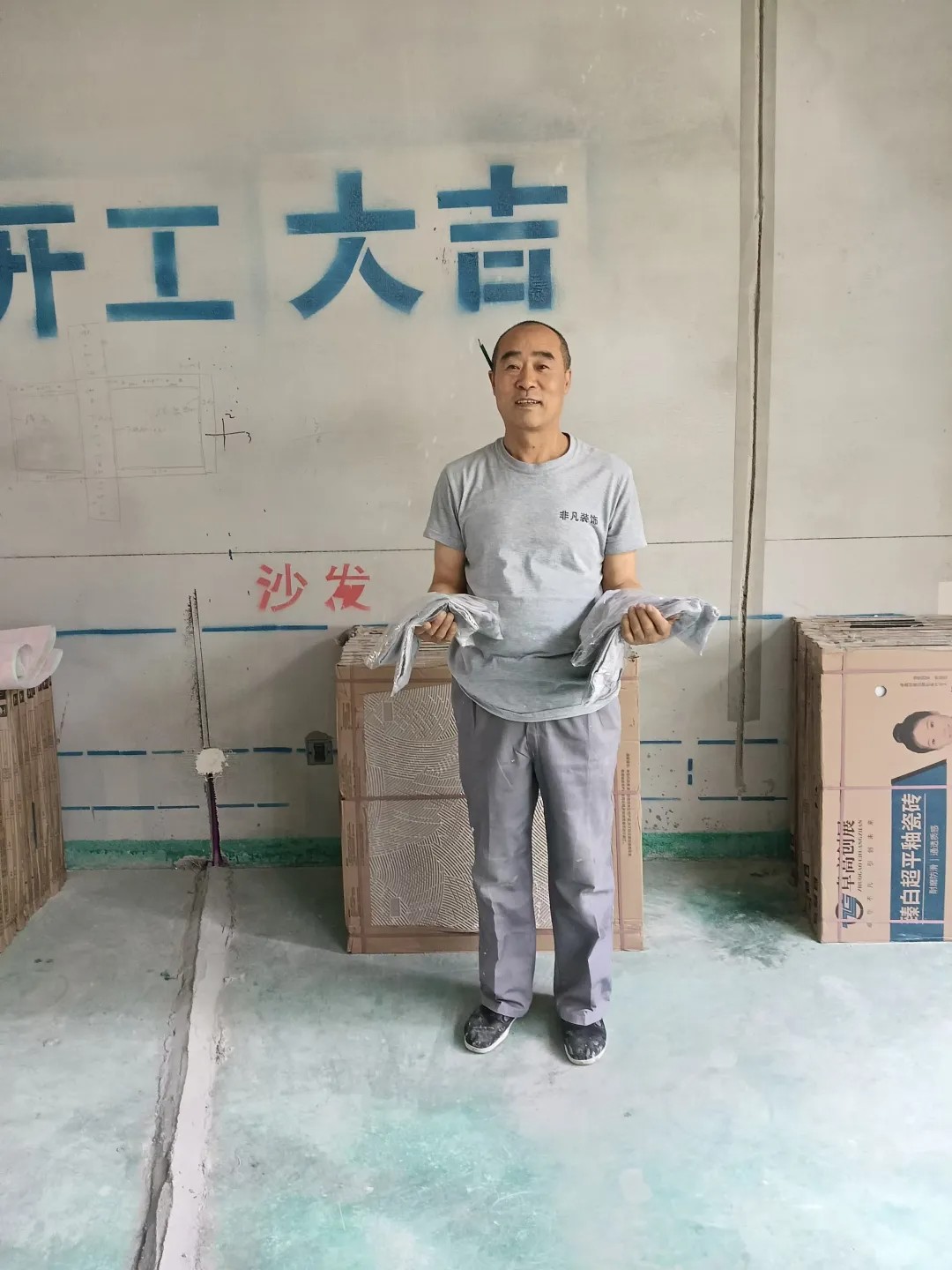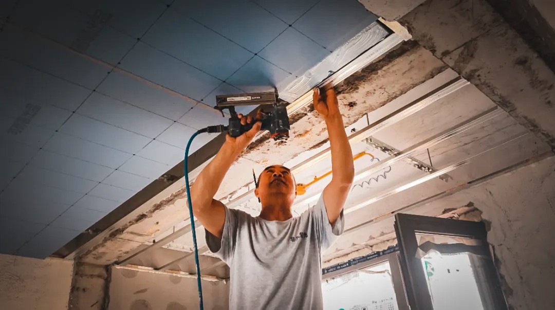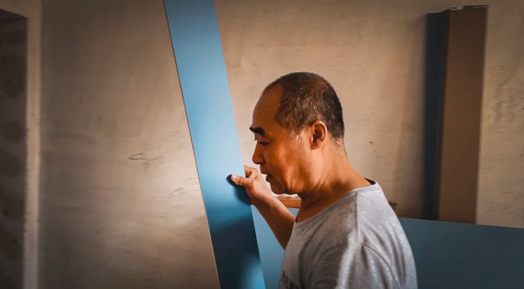 晨起的阳光穿过飞扬的微尘,倾泻在非凡装饰的工地上。六十岁的贺长海师傅稳稳立于马凳之上,双臂托举着一张沉重而巨大的石膏板,动作利落、沉稳有力。年逾花甲,身形依然挺拔,岁月在他身上沉淀为一种无声的力量。