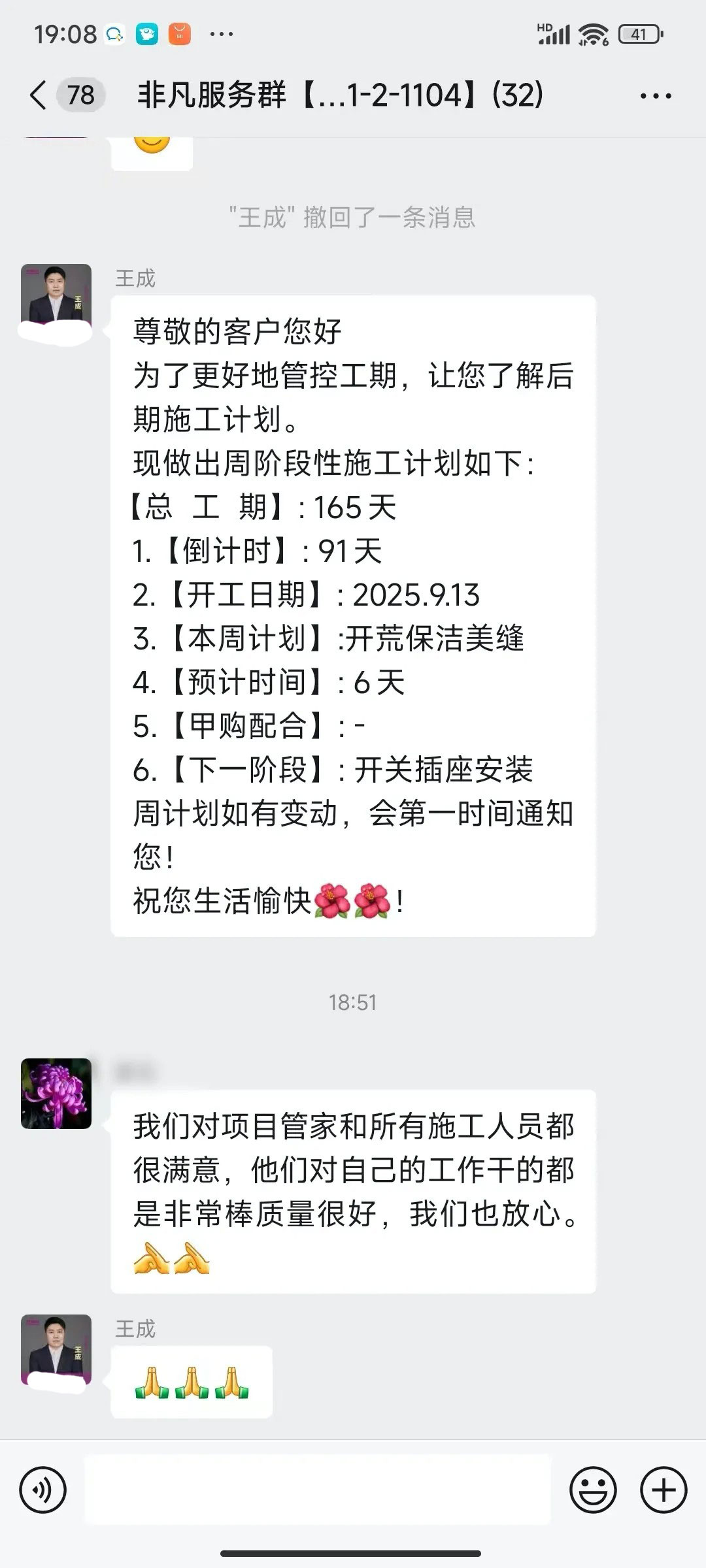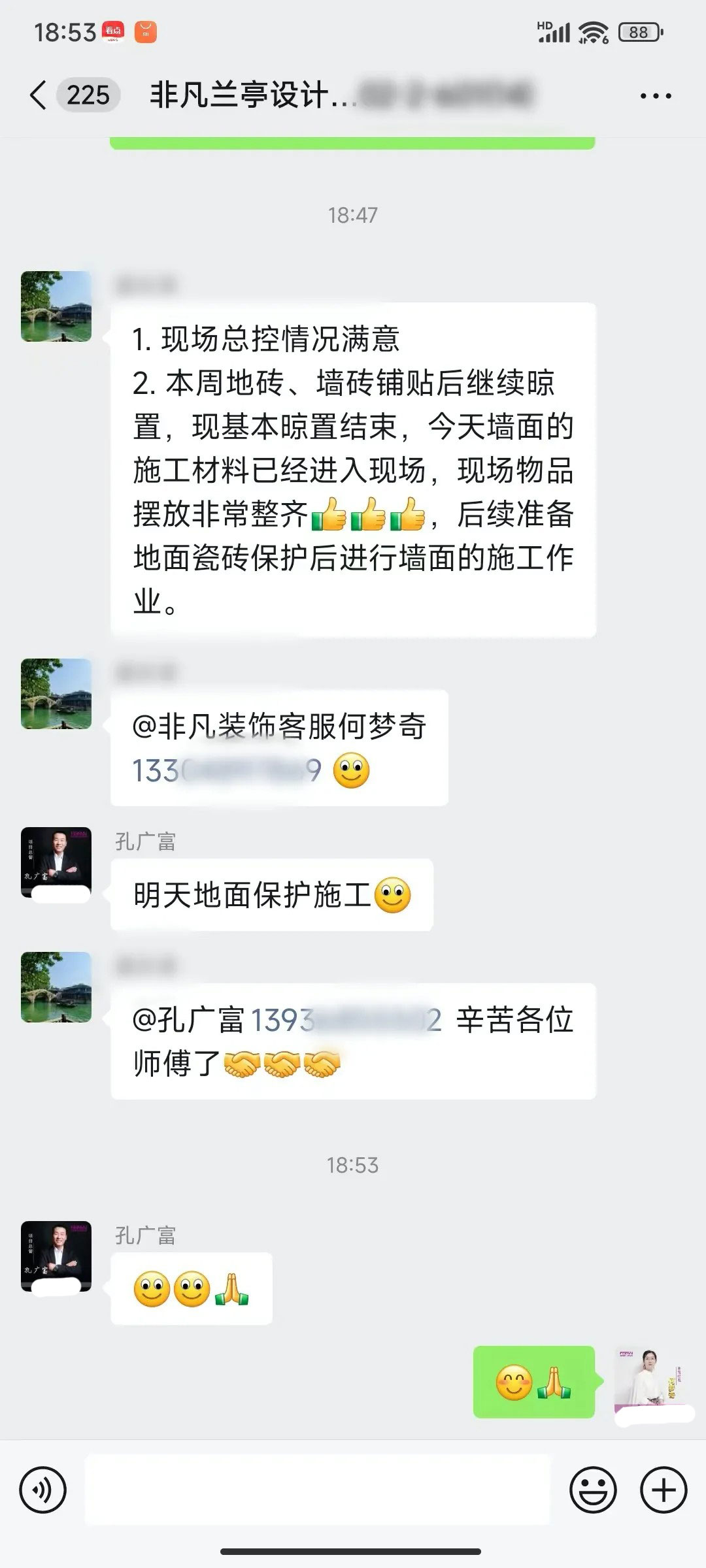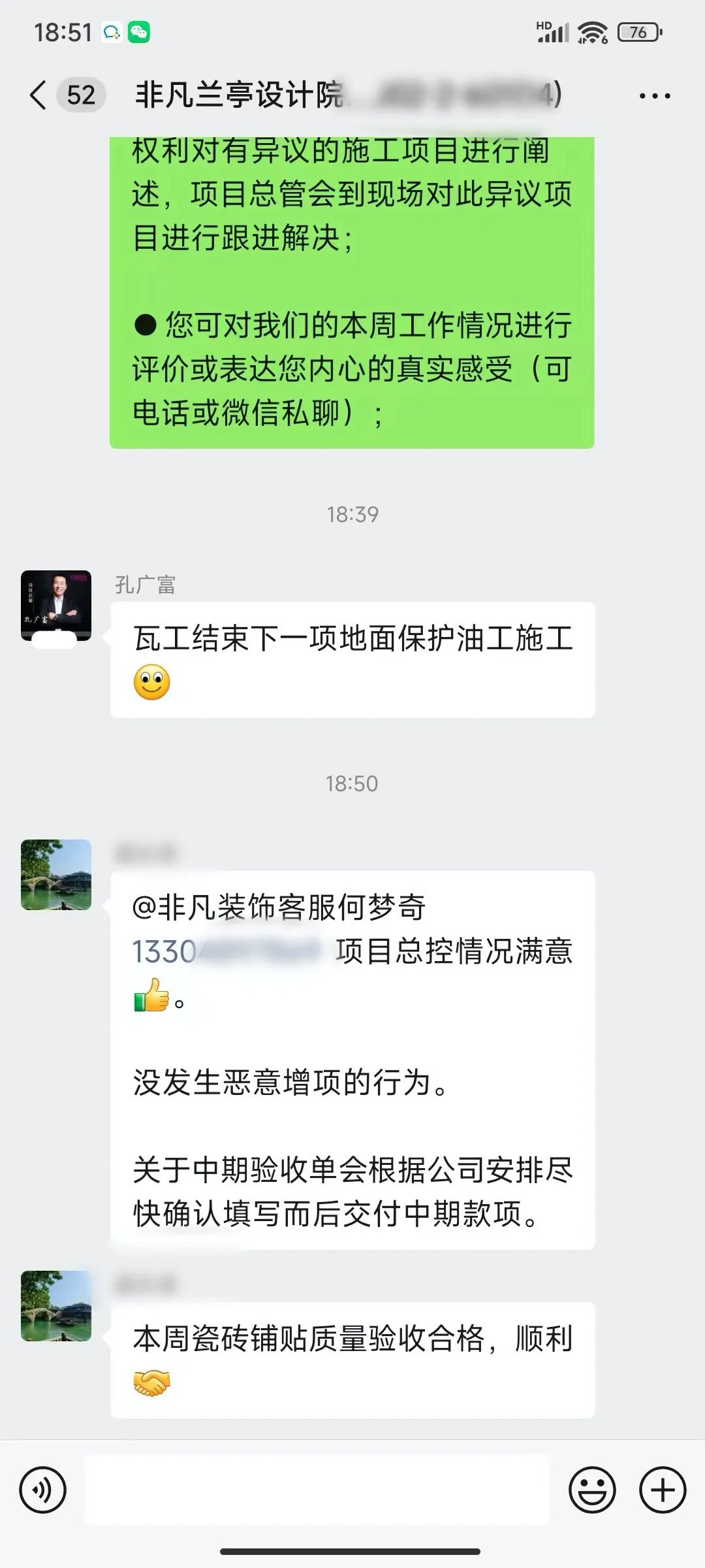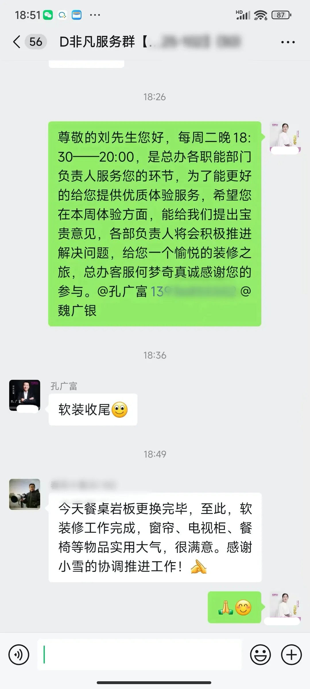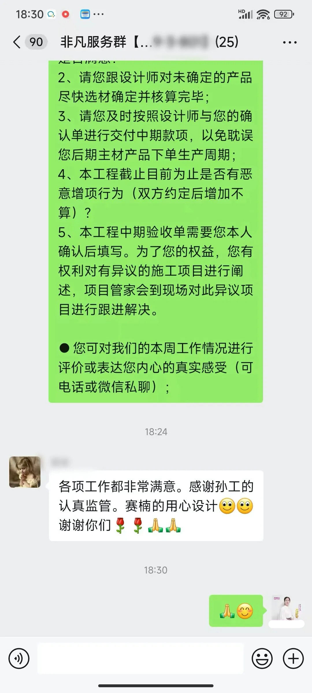 无论是日常进度查询、细节确认,还是突发状况的协调,团队均能实现快速联动与高效处理。这种始终在线、有问必应的服务状态,让业主在忙碌之余也能全程掌握装修动态,收获安心与省心的体验。