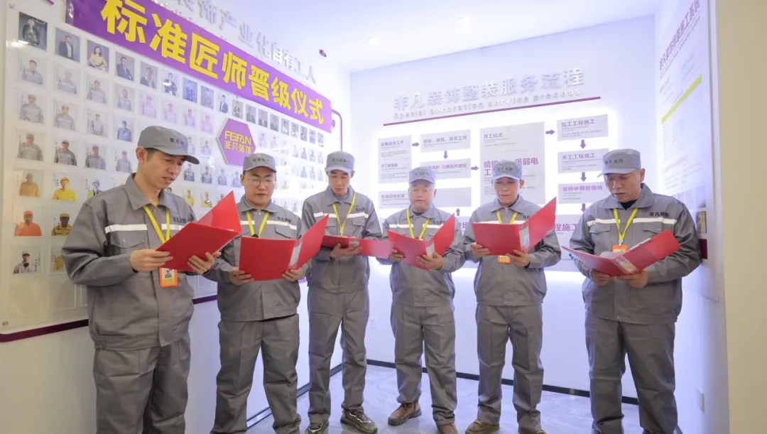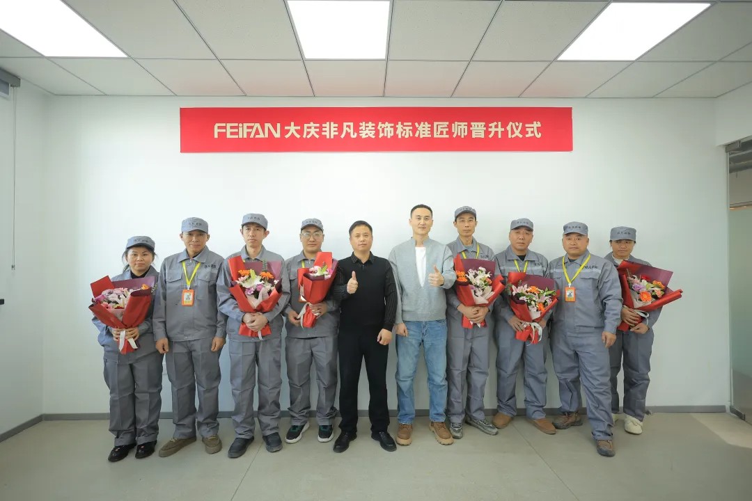 2025年终岁末,大庆非凡装饰迎来了一场庄重的仪式——六位工匠正式晋升为“标准匠师”。他们是公司的第38至43位标准匠师,共同构成了非凡装饰产业化工人体系的中坚力量。