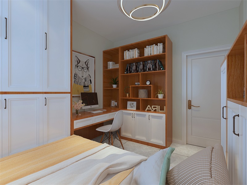 3、由于卧室内的墙壁有1/3的面积都会被柜体所遮盖,所以可以在留白的墙壁空间和家具上做些装饰,尽量装饰简单一些,主要空间可以设计的个性化一些,选择适宜的材料搭配整体色调,来烘托整体的气氛。
