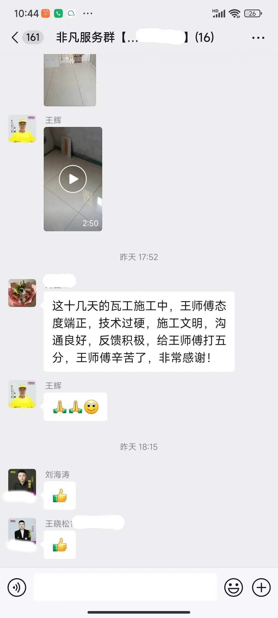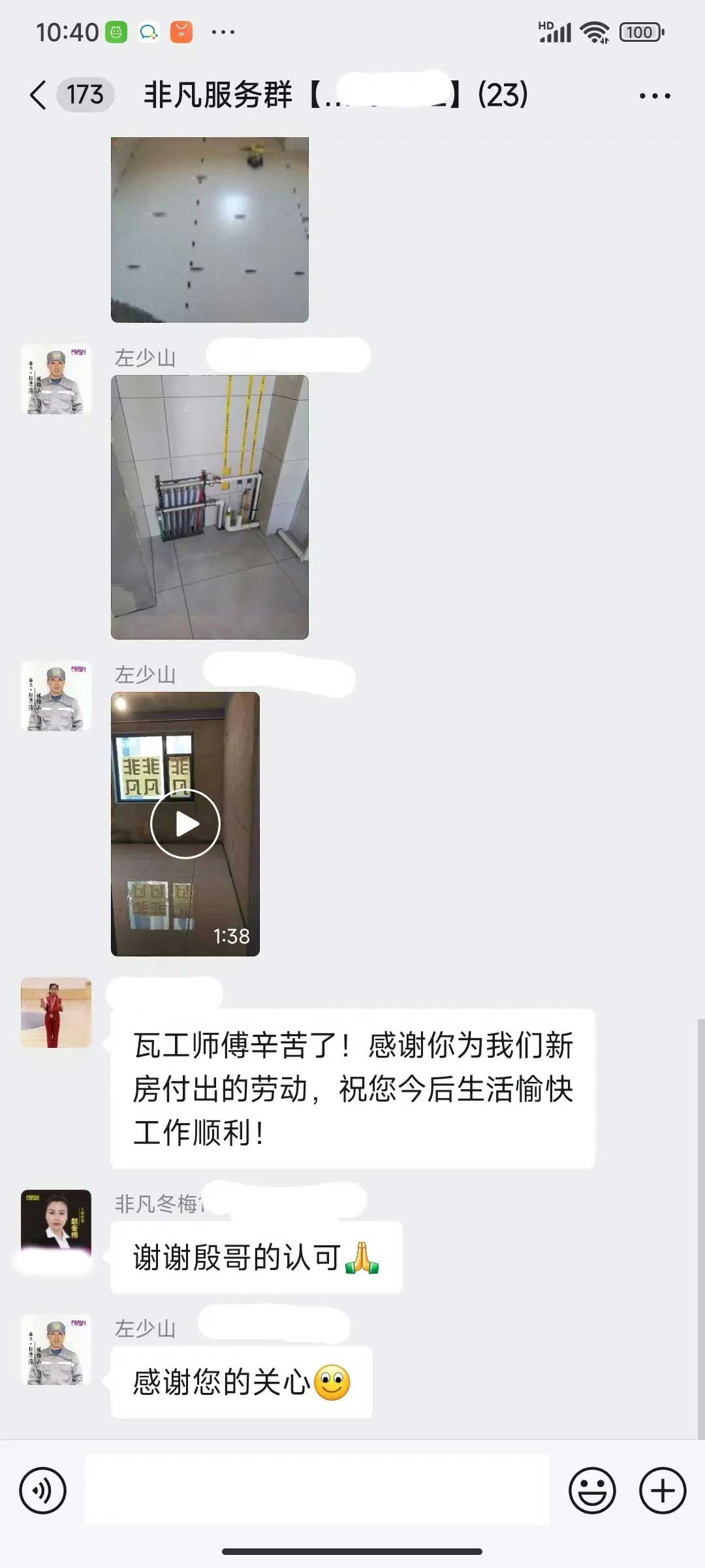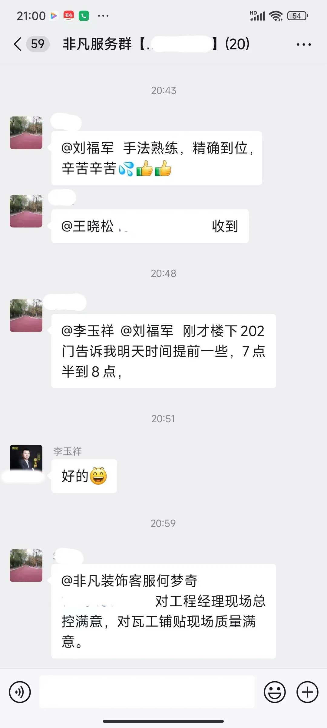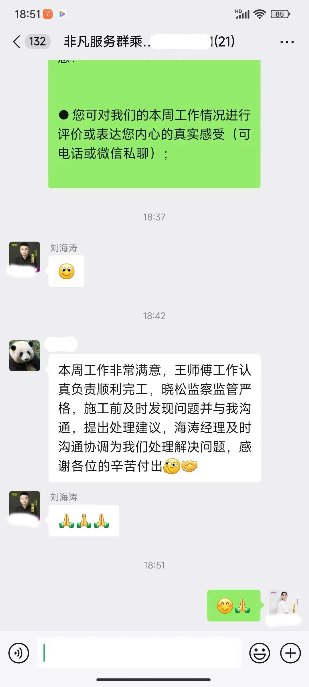 @业主们说:“活干的太好了,赏心悦目!”、“员工工作兢兢业业吃苦耐劳,我们非常放心!”、“态度端正、技术过硬、施工文明、沟通良好”...