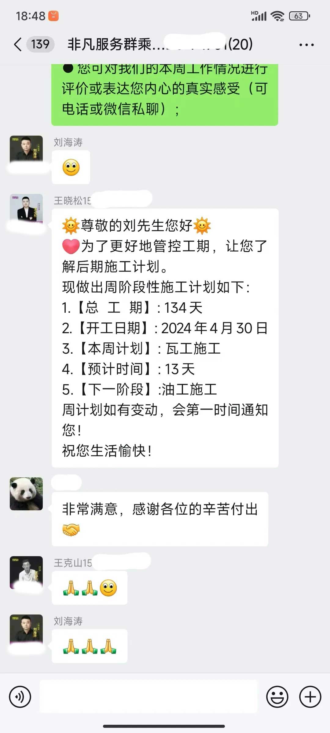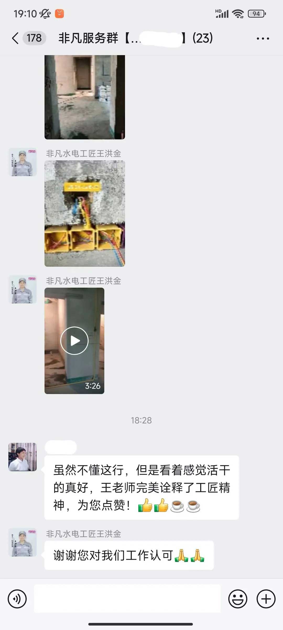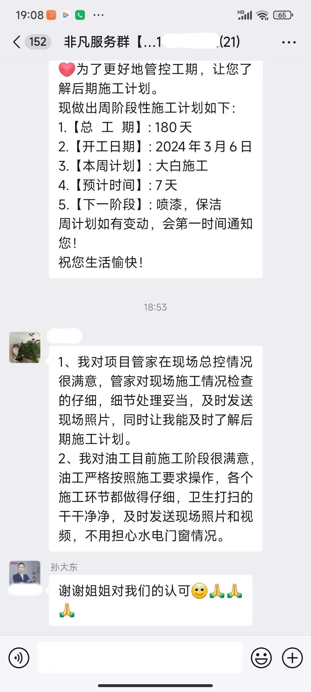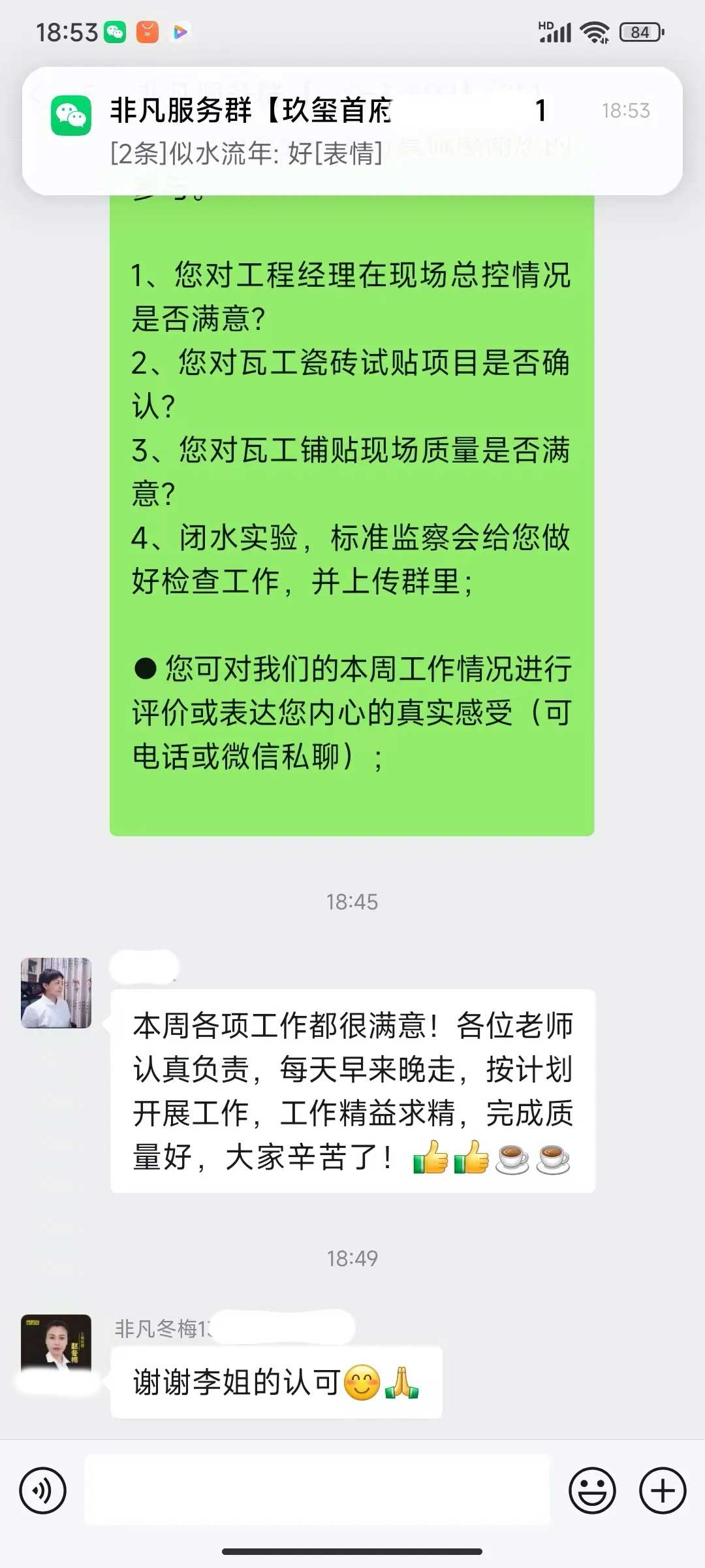 @业主们说:“活干的太好了,赏心悦目!”、“员工工作兢兢业业吃苦耐劳,我们非常放心!”、“态度端正、技术过硬、施工文明、沟通良好”...