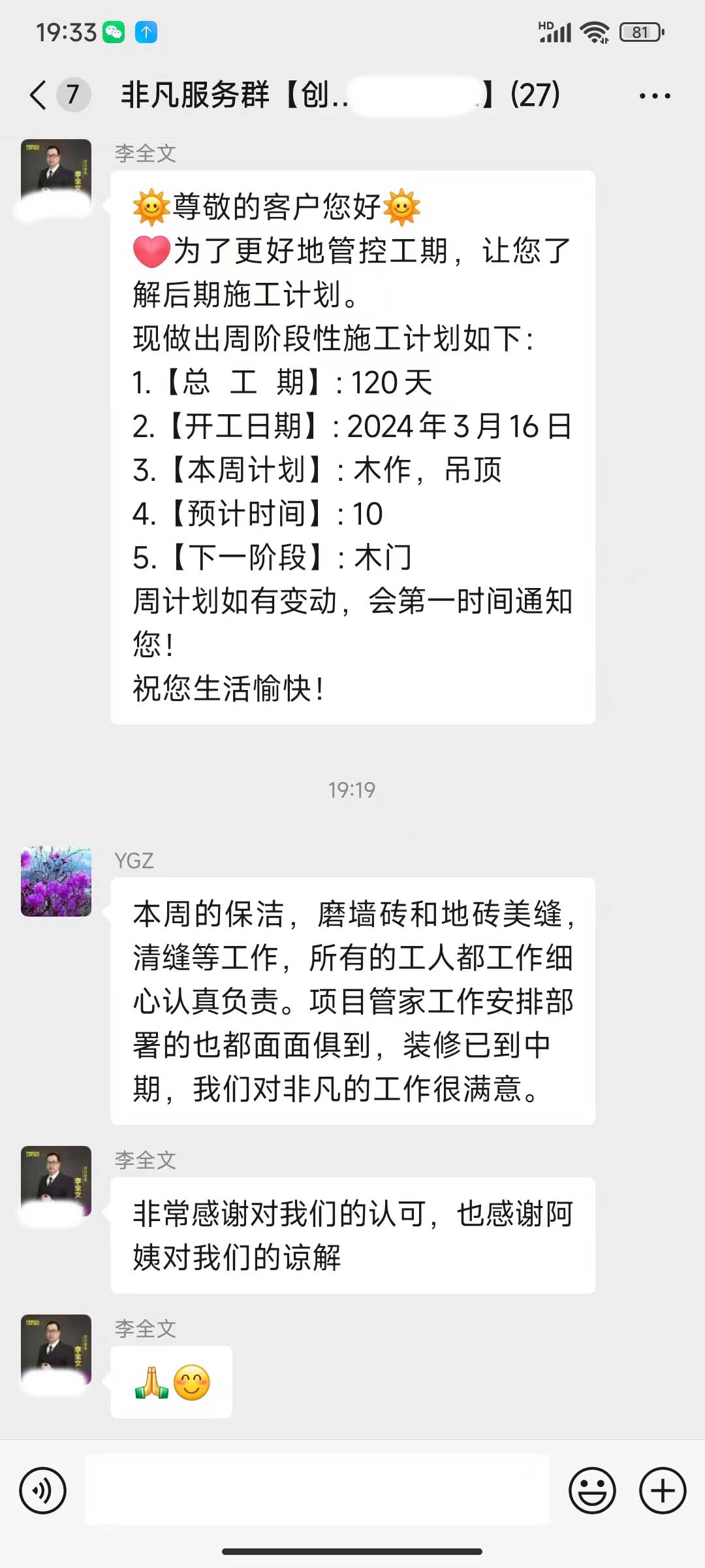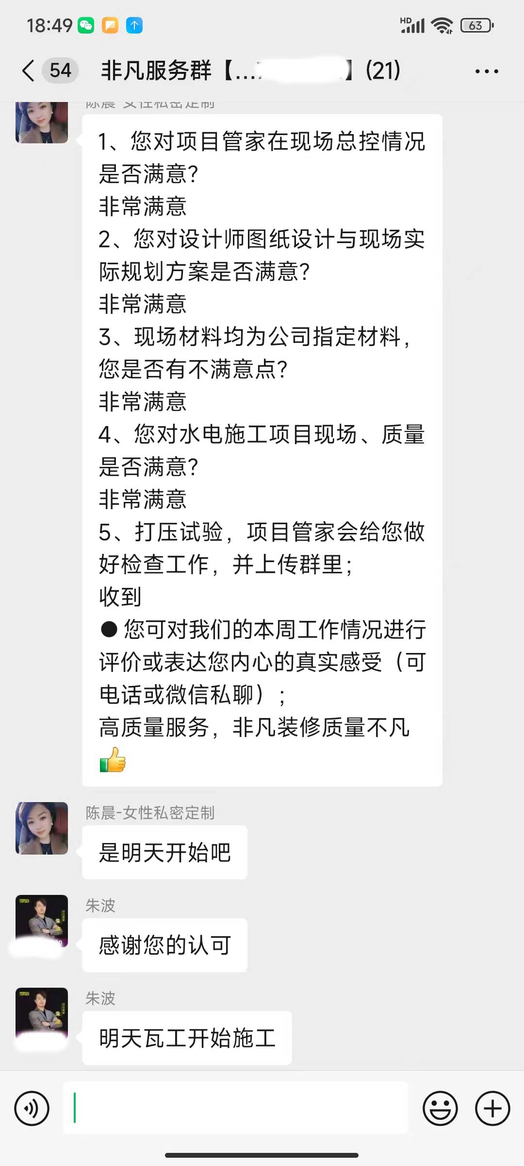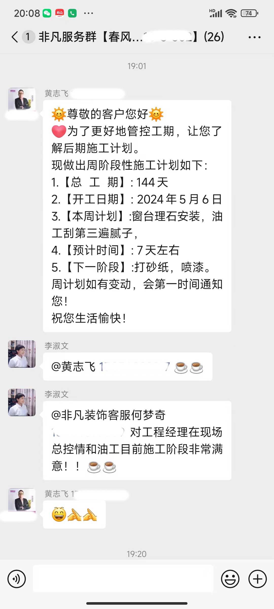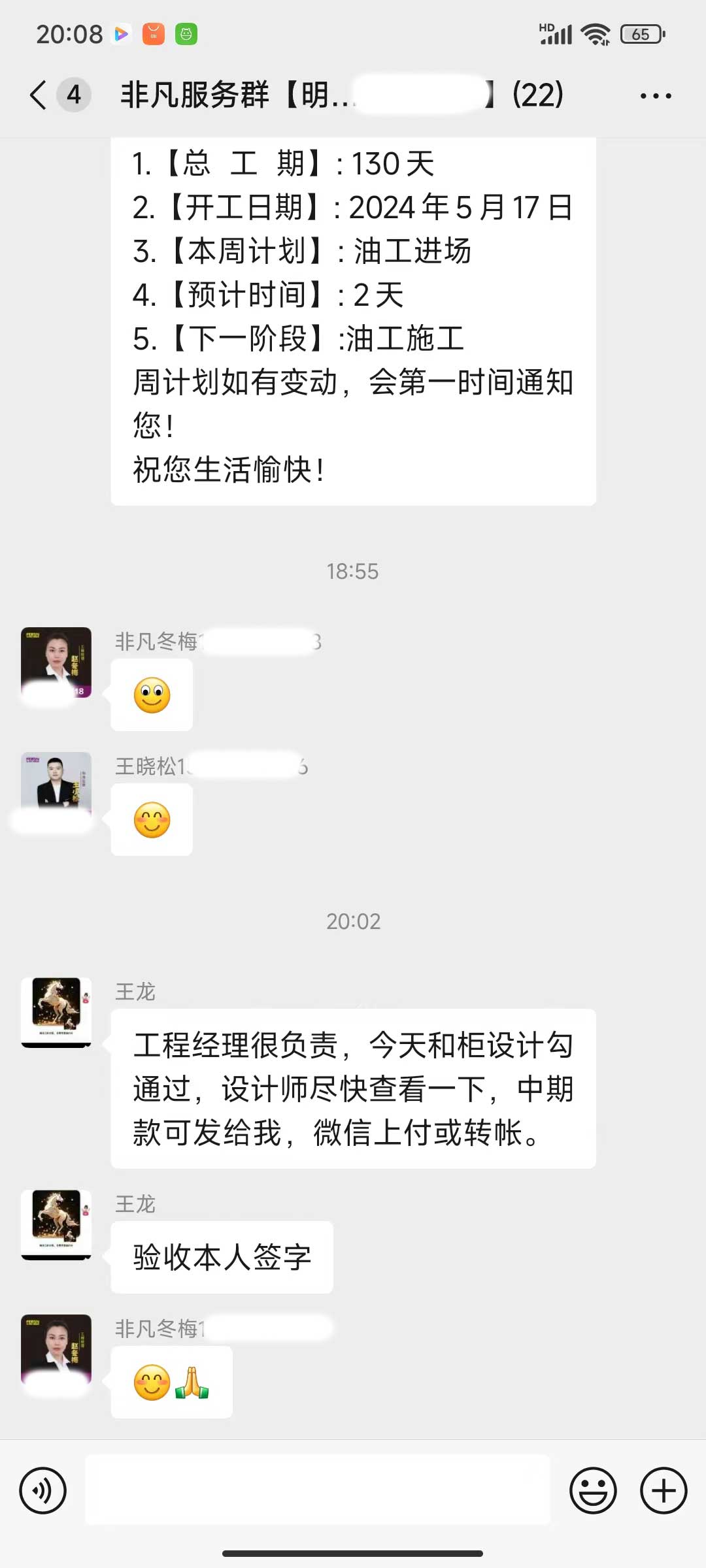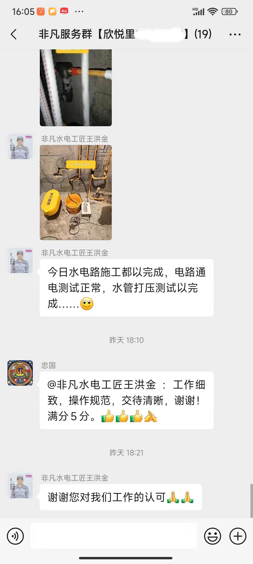 每天都在群里汇报当日的施工进度和施工内容