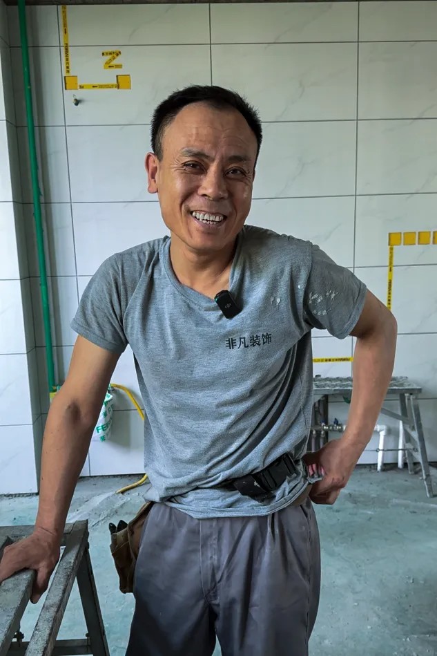 “你看我干完那边那棚,还有那个卧室那个,都没有手指印。“喜春师傅还特别维护工地的环境,边干边擦,忍不住向我们“炫耀”起来。