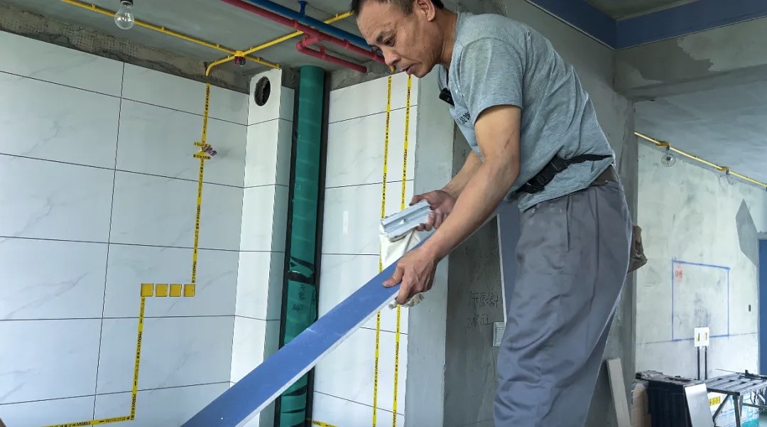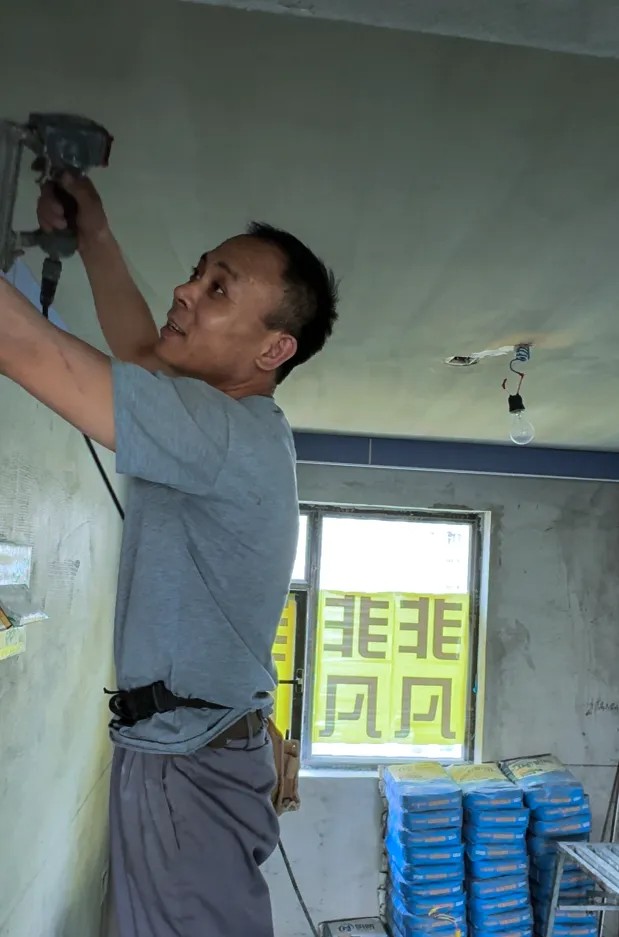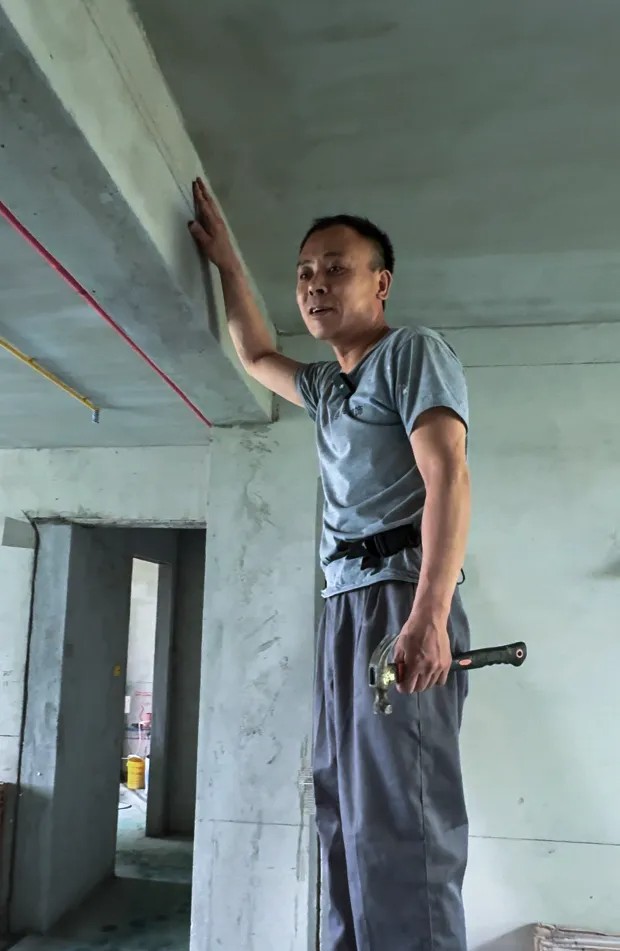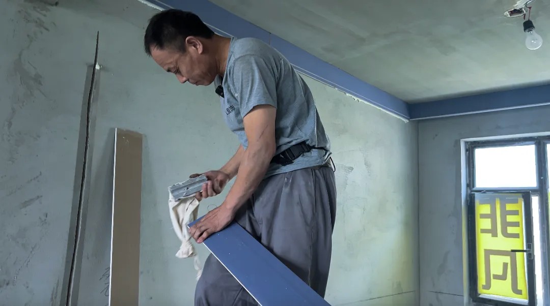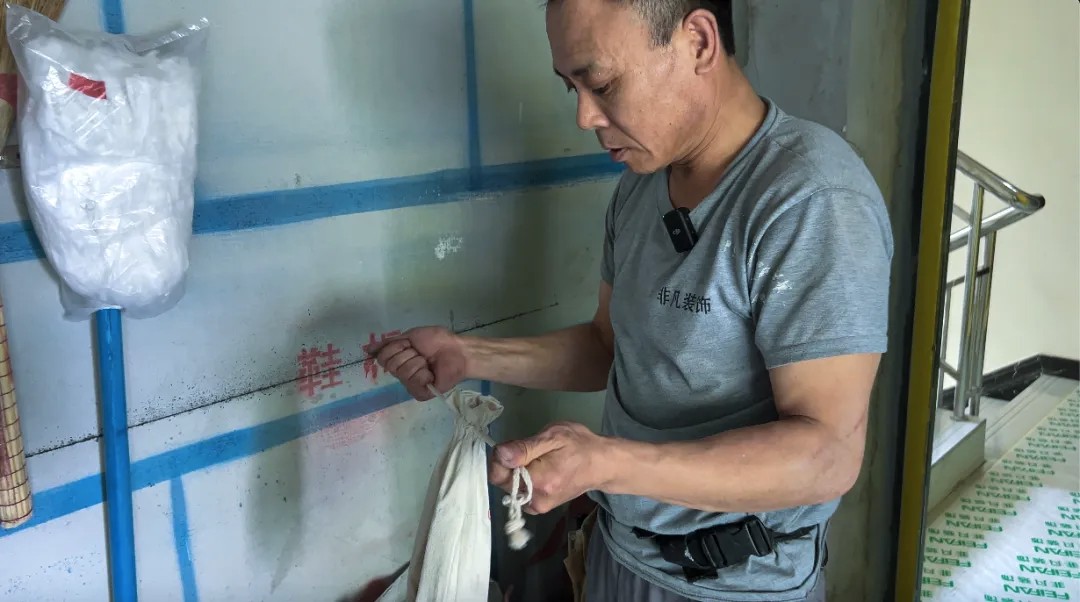 为了使墙面横平竖直,误差更小,喜春师傅干活的时候总是携带着自备的鱼线。他拥有非凡的耐心和专注力,不仅活干的漂亮,还特别喜欢动脑子研究。腰间的小小工具包里装满了他的“奇思妙想”。