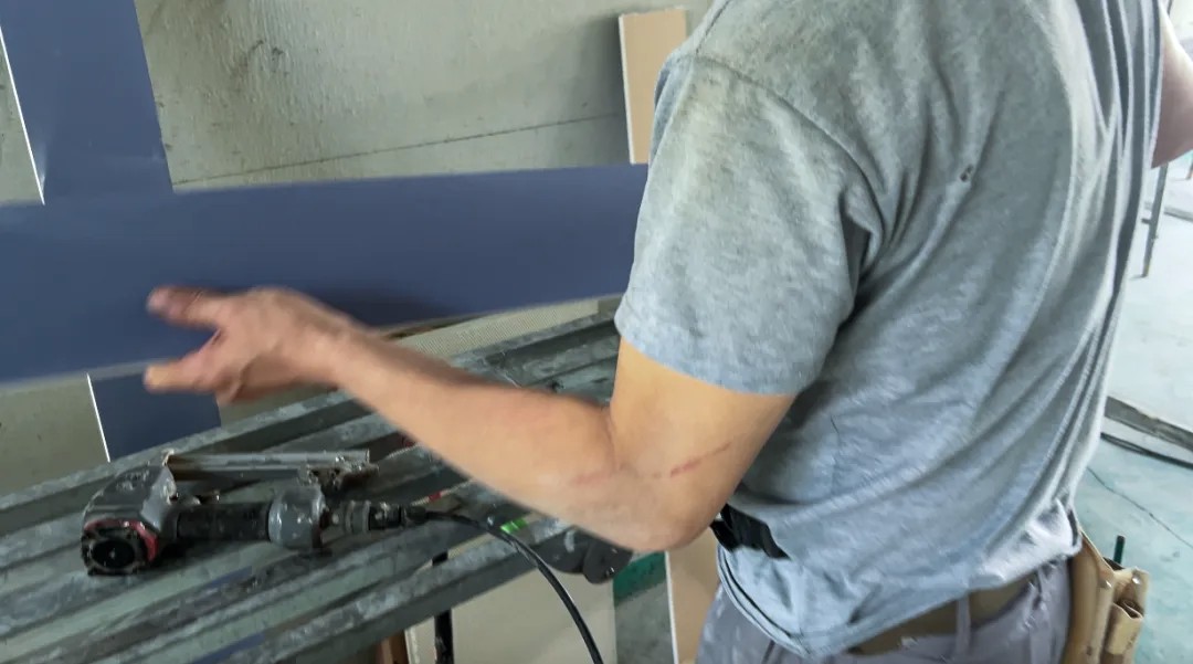 “你看咱家这个轻钢龙骨都是定制的,比国家的标准还高!并且咱公司检查的标准也特别严格,像这个吊筋间距不能大于600mm,咱们固定石膏板的这个钉也不是普通的气儿钉,用的是旋入式自攻磷化钉,这样咱们的造型棚面就特别结实牢固。”