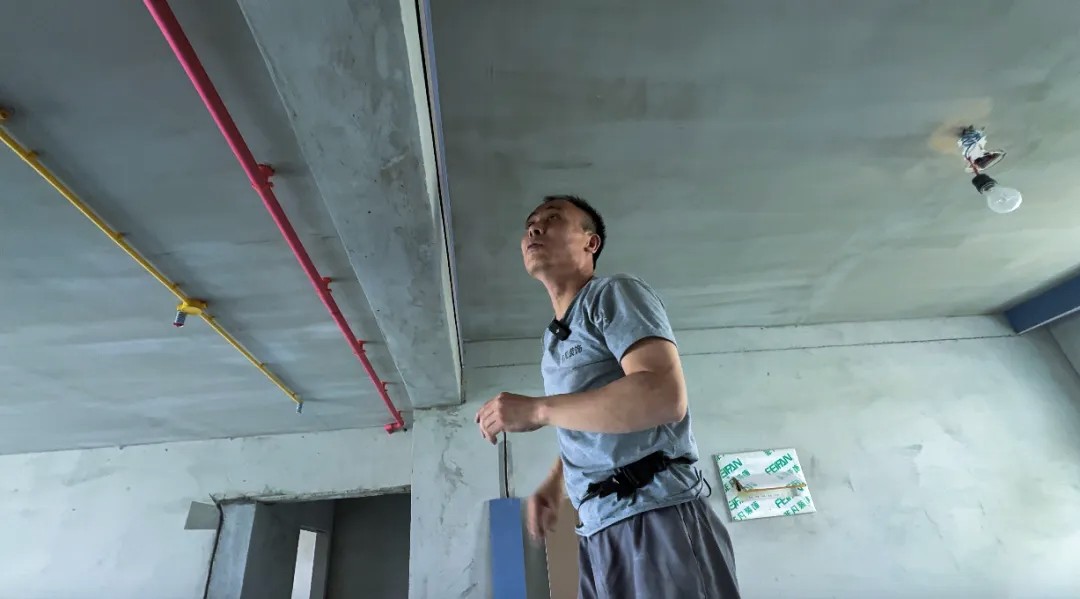 “正常墙面平了全剩一公分,你要墙面弯的话再去找平,就剩5毫米了,你看我这个挂线找直的,就他刮完腻子以后保证全剩一公分。”