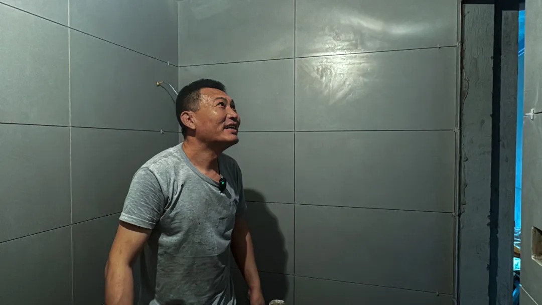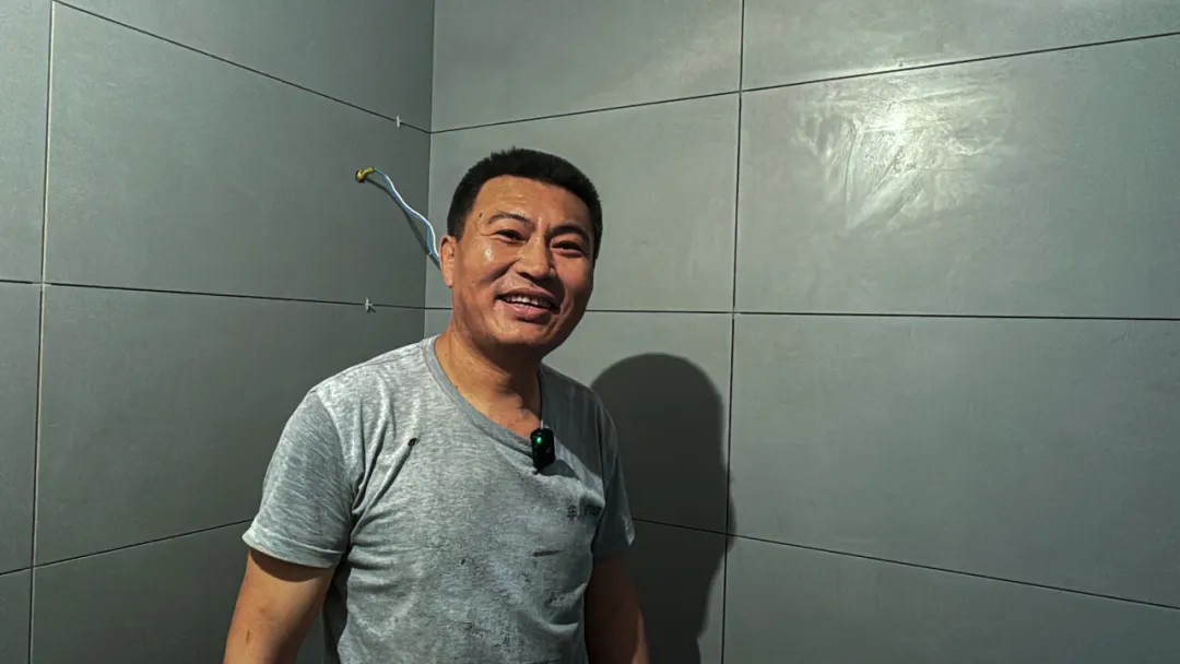 采访间隙,正好业主来检查工作,业主是这样评价贺师傅的:“这瓦工师傅特别认真,我们有时候说啥要求,也不一定符不符合,特别是前面我说原来我装过两次,缝没有这么宽,咱也不懂,完了人家给你解释,非常耐心,师傅特别好!”