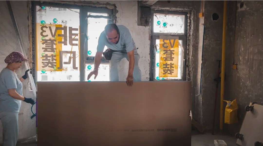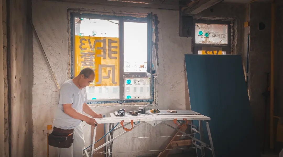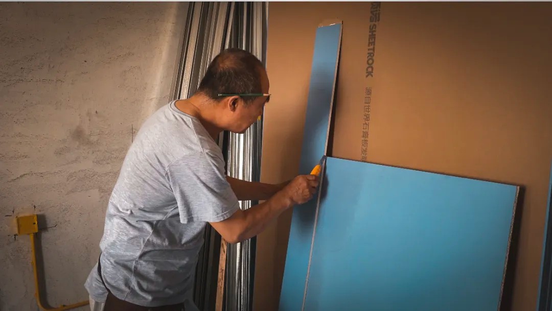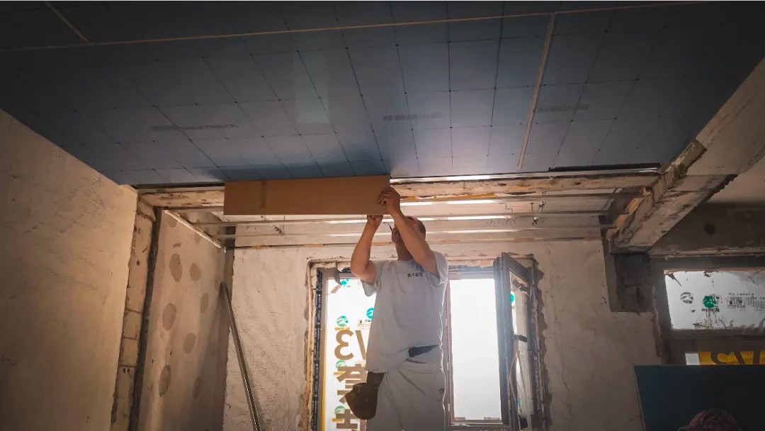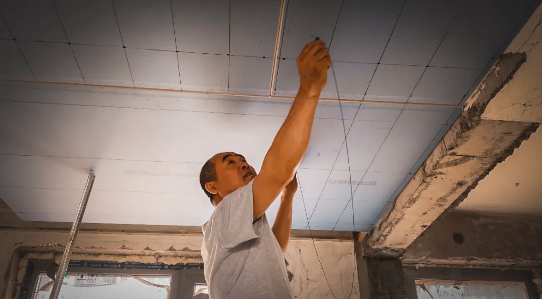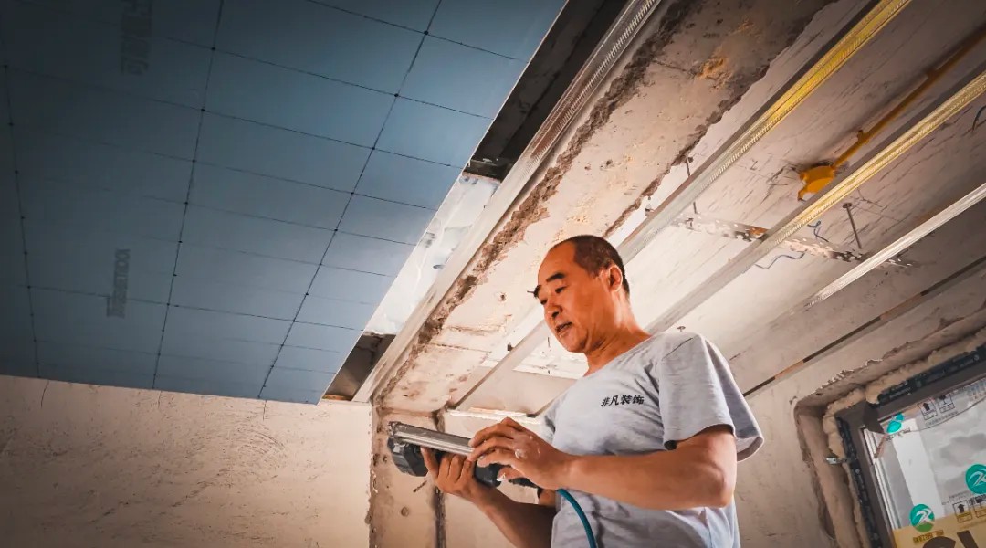 晨起的阳光穿过飞扬的微尘,倾泻在非凡装饰的工地上。六十岁的贺长海师傅稳稳立于马凳之上,双臂托举着一张沉重而巨大的石膏板,动作利落、沉稳有力。年逾花甲,身形依然挺拔,岁月在他身上沉淀为一种无声的力量。